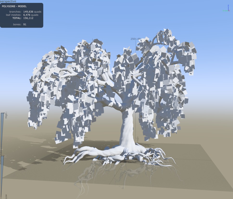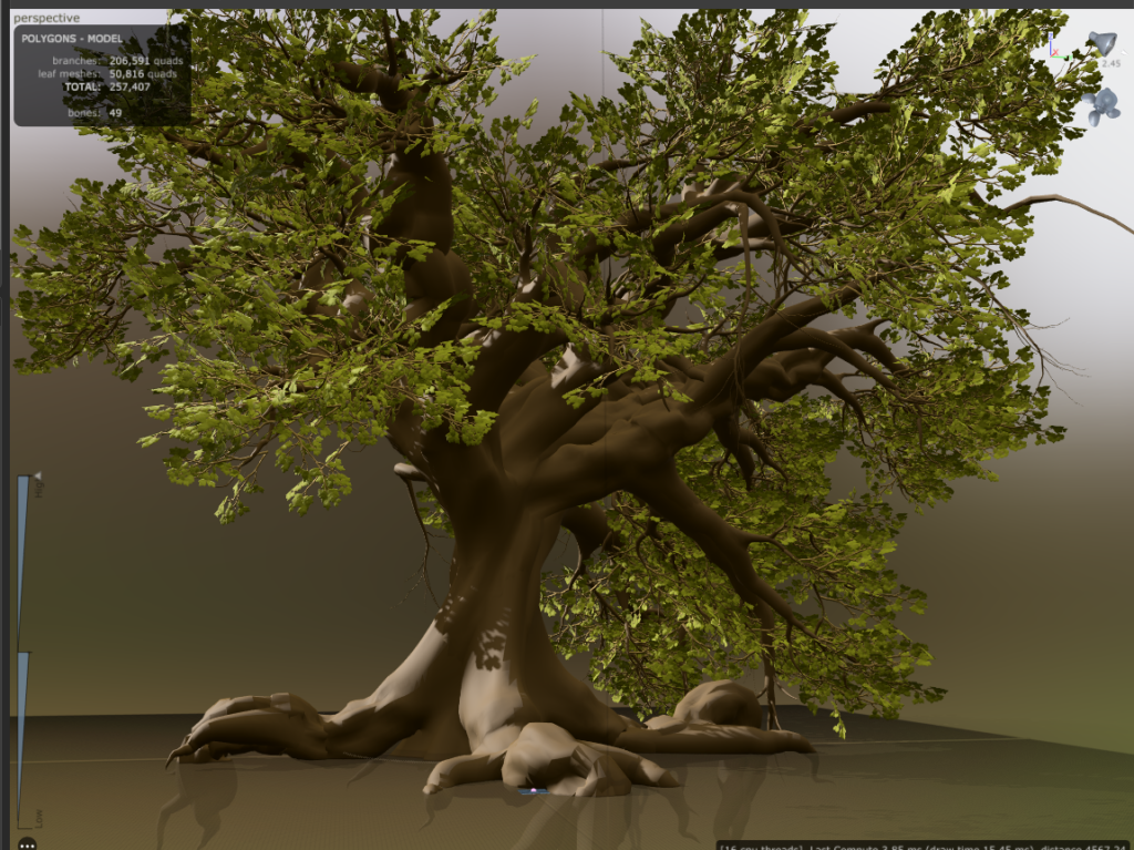 From an atmosphere standpoint, we also felt the scene lacked a bit of fantasy and that the trees were generally too small. Beyond improving the mood, larger trees can actually benefit performance ; one highly detailed tree is usually cheaper to render than many smaller ones clustered together. That’s how we started creating what we call mega-trees.